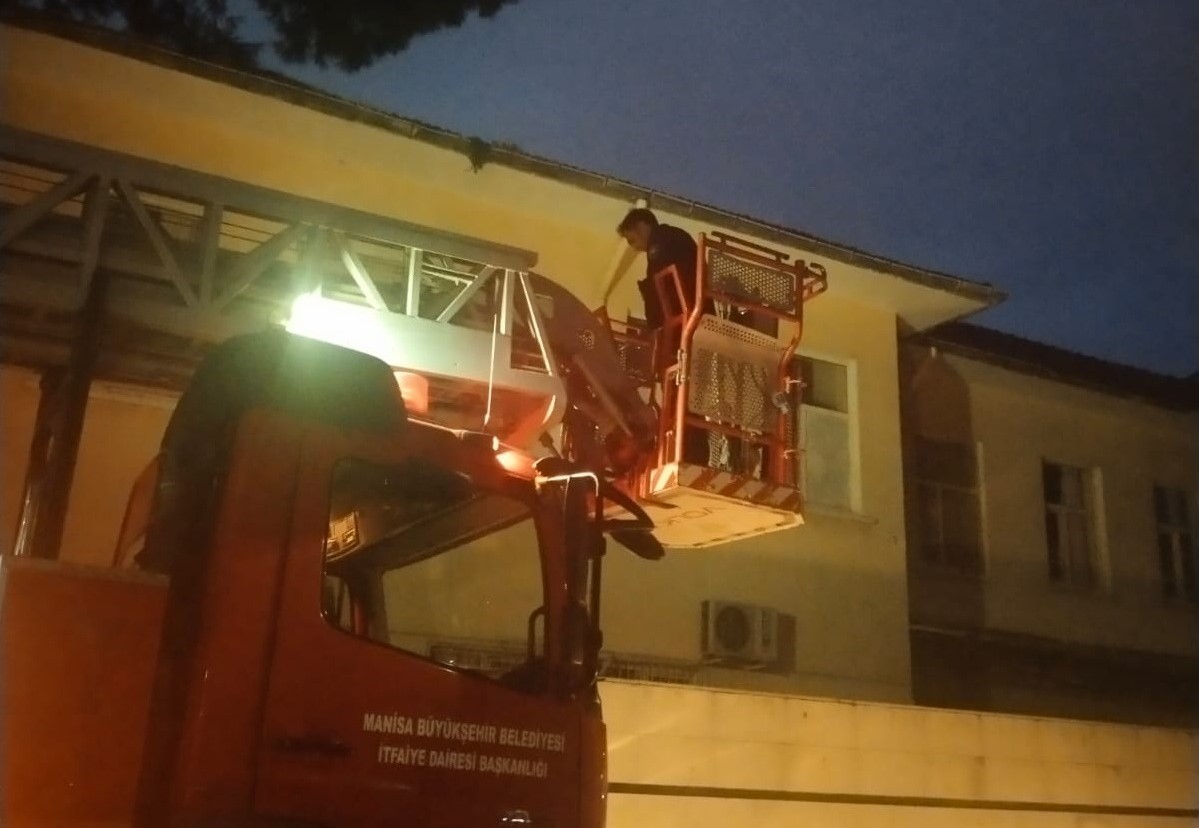 Manisa’nın Salihli ilçesinde okul çatısında mahsur kalan kedi, itfaiye ekiplerinin çalışmasıyla kurtarıldı.